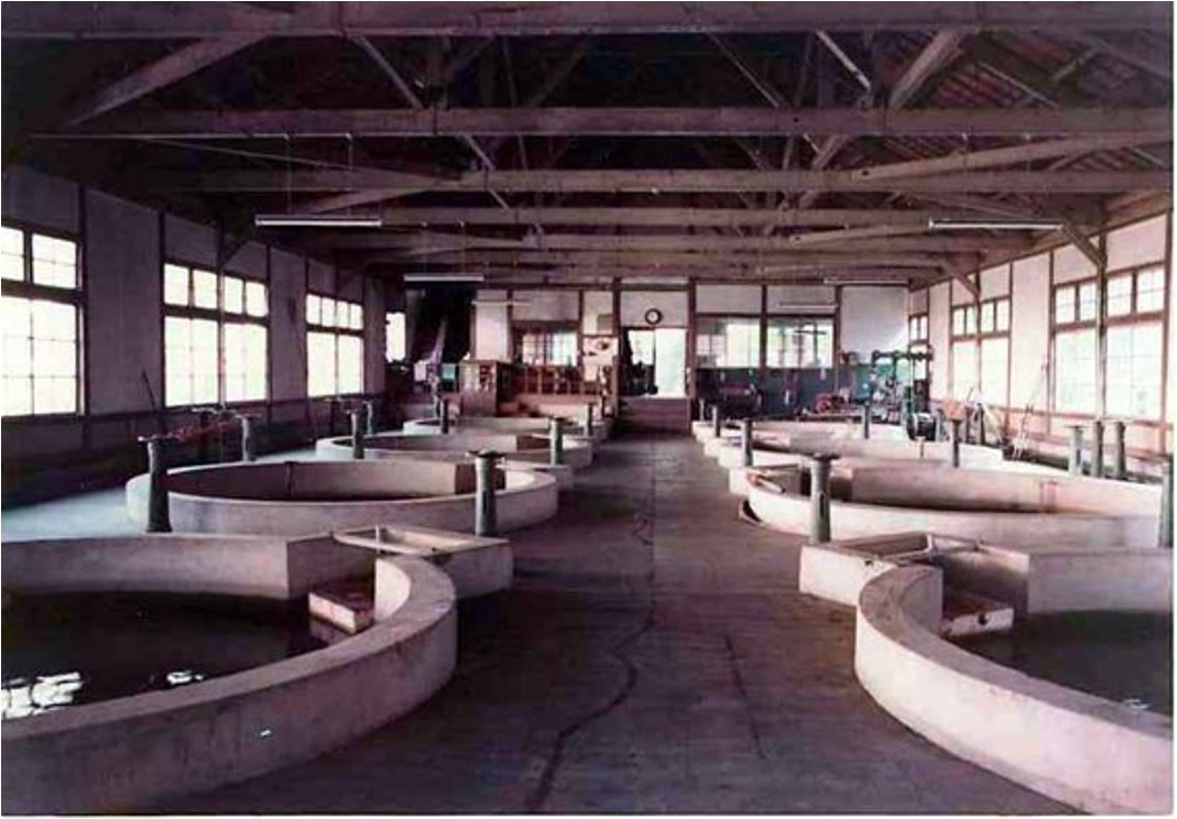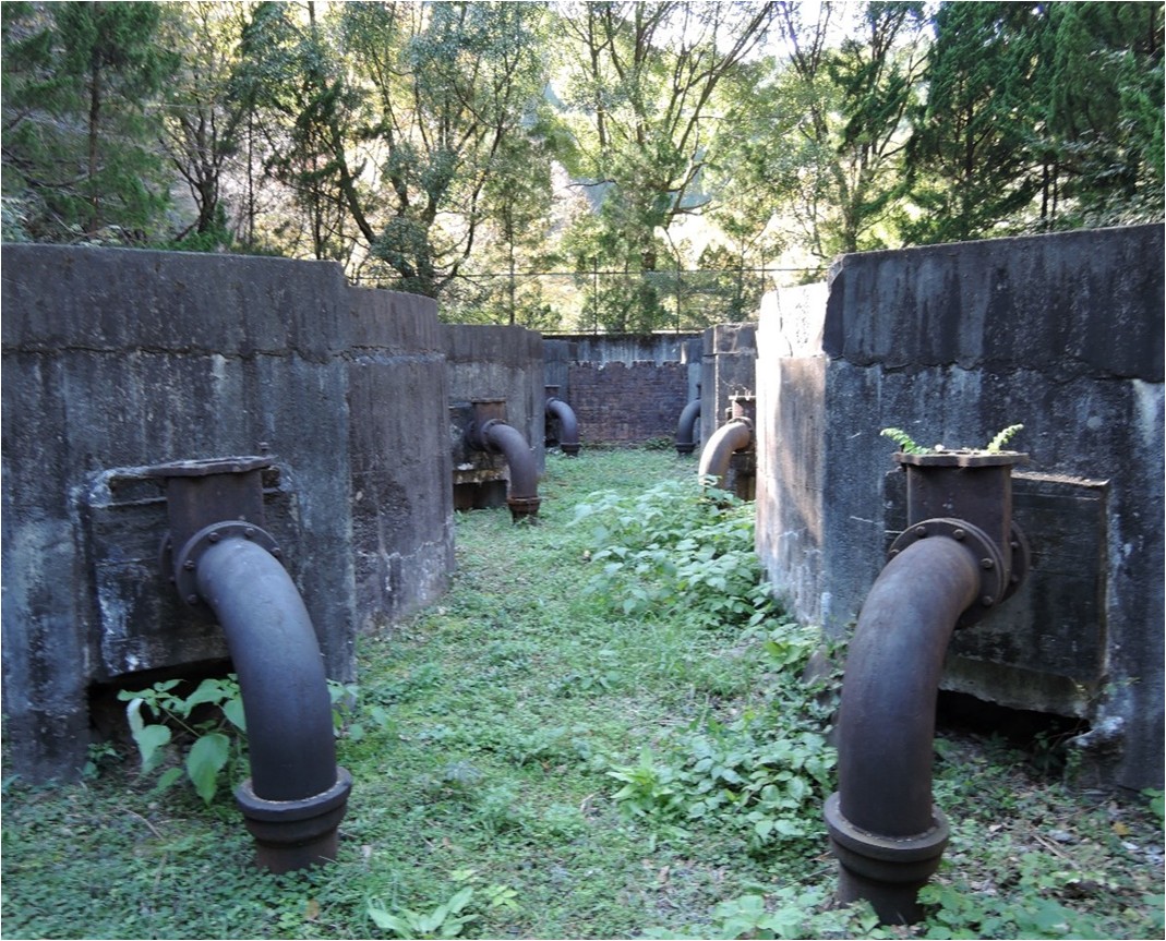 | この建造物は、大正15年 (1926年)の上水道創設時に設置された浄水施設の一部で「JL式急速ろ過池」と呼ばれ、全部で8池あります。 フロート(ぶい)を利用し半自動で水量調整ができるという、当時としては斬新なもので、さらに円形構造の急速ろ過法の採用により、ろ過池の面積を少なくし、効率的な用地の利用を図った施設となっています。 ※ JL式 … アメリカの Jewell Pure Water 社が開発した、当時最新のろ過池の方式です。 昭和51年3月の須賀川ダムおよび現柿原浄水場の完成により、すべて取り除く予定でしたが、県下初の上水道として創設された施設であることなど、その文化的価値から、県の許可を得て保存しているもので、往時の姿を現在に留めております。 | |