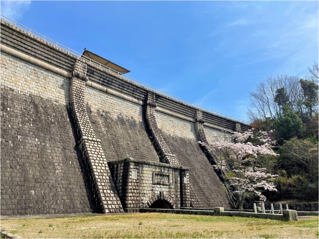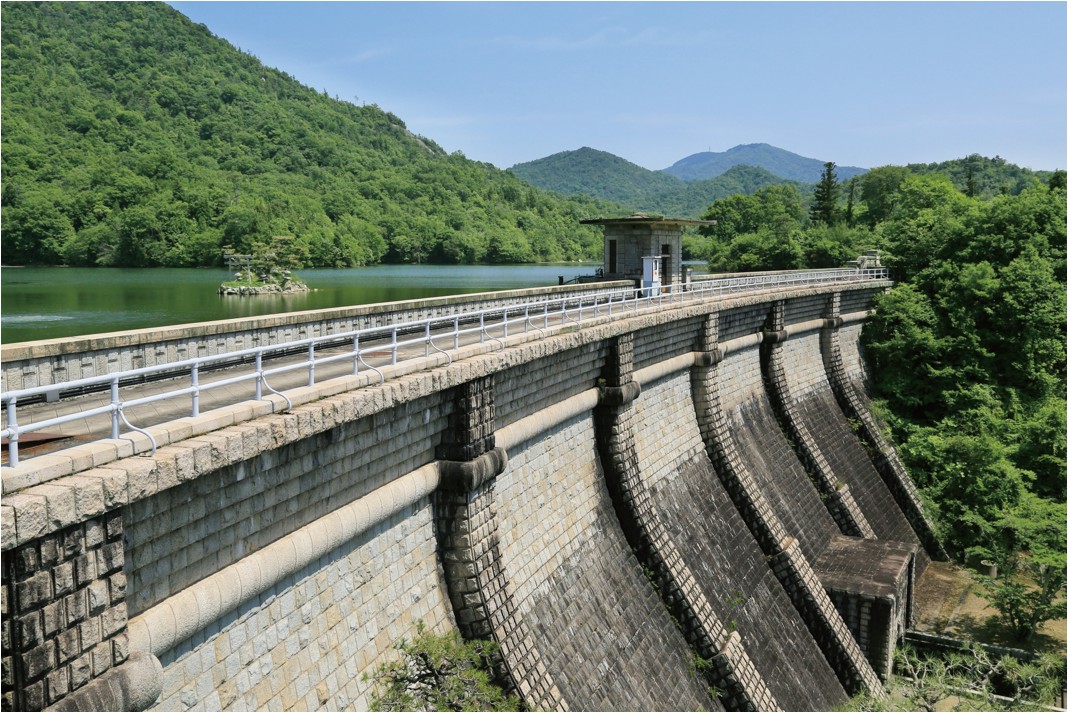 | 呉市の本庄水源地は,軍港施設の拡張に伴う水不足を解消するために大正7年(1918年)に海軍によって築造された貯水池です。貯水面積は28万3千㎡,総貯水容量は約196万㎥です。 当時の海軍土木技術の粋を結集して築かれた堰堤は,花崗岩を用いた豪華で美しい外観が特徴で,芸術的・歴史的に高く評価されています。 現在も呉市水道の基幹施設として現役で稼働しており,平成11年(1999年)には,稼働中の水道施設として全国初の「国重要文化財」に指定されました。 | |