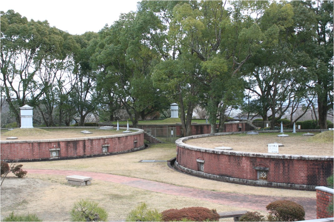 | 一号から三号の円形配水池は同じ構造であり、一号、二号が創設時 (明治38年)、三号が第1期拡張工事 (大正8年) の建築です。直径20.65メートル、深さ4.5メートル、容量1,170立法メートルで、現在も稼動しています。全国的に類例の少ない円形配水池です。 | |
