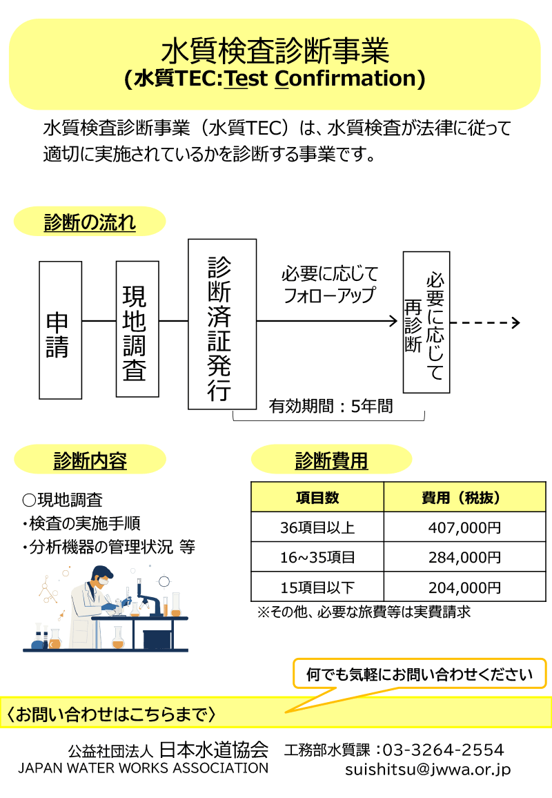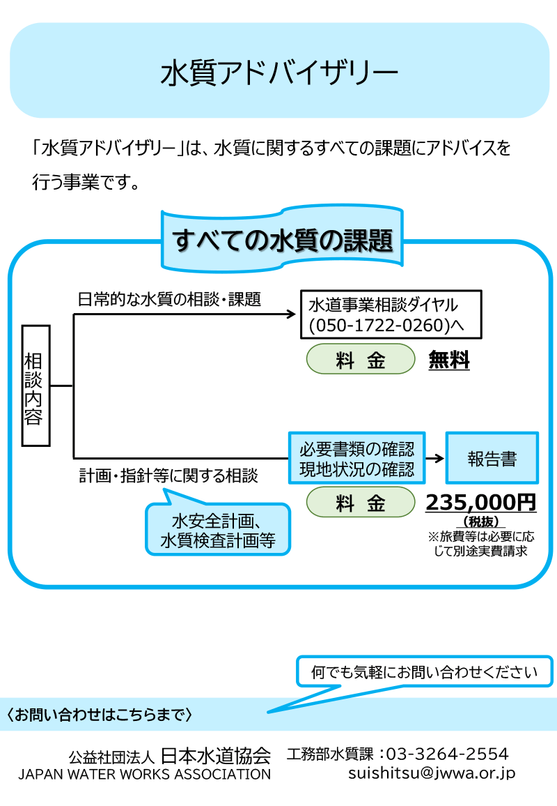 日本水道協会では、水道事業体等が抱える水質に係るすべての課題解決を“水質応援プログラム”でサポートします。 水質応援プログラムは、次の3つの取り組みを柱としており、規模に関わらず全国の水道の水質管理向上に全力で応えてまいります。 ※それぞれの柱をクリックで詳細を表示します。