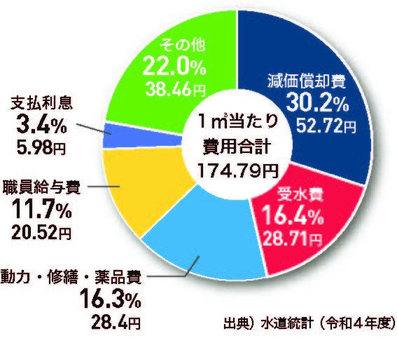 水道水1m3当たりの生産費用は、減価償却費、受水費、動力費等で構成されています。このうち、減価償却費は生産費用の約3割を占めています。これは、老朽化した水道施設の再構築や、水質の安全性と水道水源の安定を確保するためのダム等への投資、また水源の水質悪化に伴う高度浄水処理の導入等が要因として考えられます。
