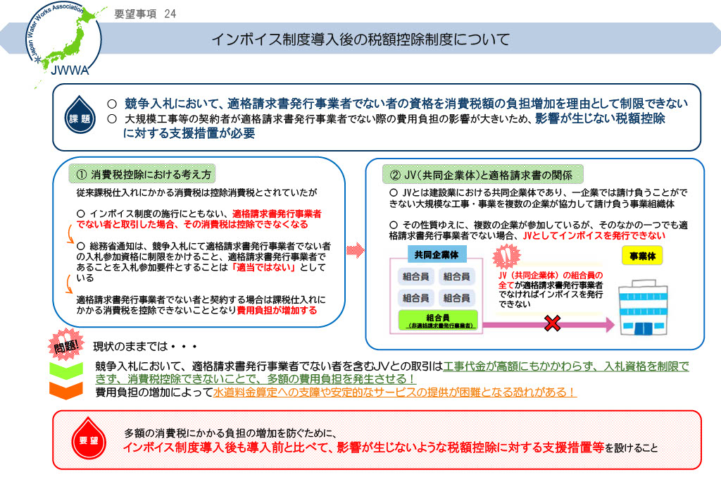 公営企業では、大規模な工事等の契約者がJV(共同企業体)となることが多く、仮に契約先に適格請求書発行事業者でない者が含まれていた場合に、控除できなくなる消費税の額も多額となるため、収支見通しを立てたうえで設定する水道料金の算定に支障が生じるなど、影響は大きい。