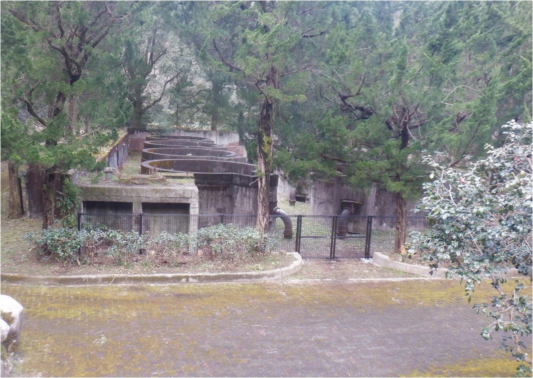 | この建造物は、大正15年 (1926年)の上水道創設時に設置された浄水施設の一部で「JL式急速ろ過池」と呼ばれ、全部で8池あります。 フロート(ぶい)を利用し半自動で水量調整ができるという、当時としては斬新なもので、さらに円形構造の急速ろ過法の採用により、ろ過池の面積を少なくし、効率的な用地の利用を図った施設となっています。 ※ JL式 … アメリカの Jewell Pure Water 社が開発した、当時最新のろ過池の方式です。 昭和51年3月の須賀川ダムおよび現柿原浄水場の完成により、すべて取り除く予定でしたが、県下初の上水道として創設された施設であることなど、その文化的価値から、県の許可を得て保存しているもので、往時の姿を現在に留めております。 | |
