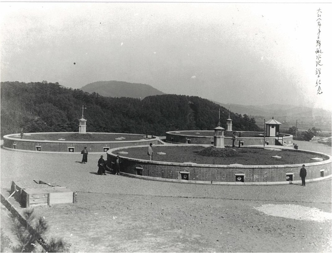 | 一号から三号の円形配水池は同じ構造であり、一号、二号が創設時 (明治38年)、三号が第1期拡張工事 (大正8年) の建築です。直径20.65メートル、深さ4.5メートル、容量1,170立法メートルで、現在も稼動しています。全国的に類例の少ない円形配水池です。 | |